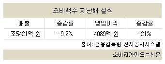 오비맥주의 지난해 매출은 1조5421억 원, 영업이익 4089억 원으로 전년 동기 대비 각각 9.2%, 21% 가량 감소했다. 오비맥주의 매출 성장세가 꺾인 것은 지난 2015년 이후 처음이다.