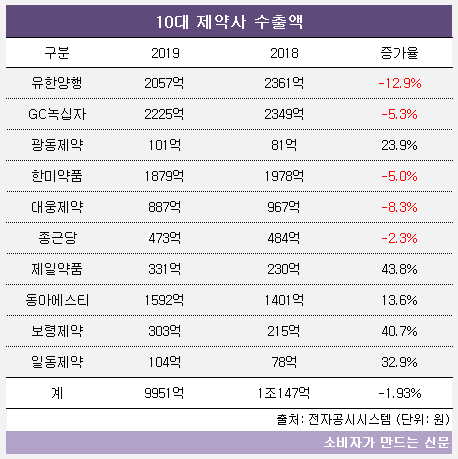 10대 제약사 가운데 수출액이 감소한 곳은 유한양행(대표 이정희)과 GC녹십자(대표 허은철), 한미약품(대표 우종수·권세창), 대웅제약((대표 전승호·윤재춘), 종근당(대표 김영주) 등 5개사다.