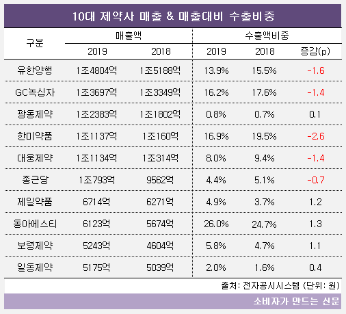 유한양행의 수출 비중은 2018년 15.5%에서 지난해 13.9%로 줄었다. 2018년 수출 비중이 19.5%로 가장 높았던 한미약품 역시 지난해 수출 비중이 16.9%로 줄었다.