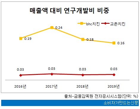 교촌치킨 측은 매출액 대비 연구개발비 비중이 낮은 데 대해 “순수 재료비만 경상연구개발비로 처리되고 그 외 비용은 견본비 등 일반항목으로 처리하고 있다. 인력비용의 경우 급여 항목에 해당한다"고 말했다.
