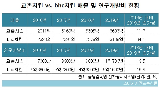 외식업계 특성상 두 회사 모두 연구개발투자에 많은 돈을 지출하지는 않는 편이지만, bhc가 교촌에 비해 더 많은 비용을 들여 신메뉴를 적극 개발하면서 실적도 호조를 보이고 있기 때문이다.