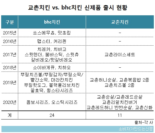 실제로 지난 5년간 교촌치킨은 11가지 메뉴를 새롭게 선보였으나 bhc치킨은 26가지 메뉴를 출시했다.
