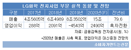 LG화학 관계자는 "올해 전지부문 목표를 15조 원으로 잡은 것은 수주금액을 기준으로 납품한다고 가정했을 때 근거를 갖고 예상되는 부분을 목표치로 잡은 것"이라며 "전지사업 자체가 흑자를 낸 적도 많았는데 투자가 많아서 작년 영업손실이 났다. 올해 흑자전환 가능성을 높게 보고 있지만 코로나 변수도 존재해 확신할 수는 없다"고 말했다.