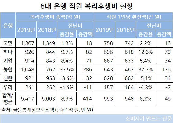 금융감독원 금융통계정보시스템에 따르면 지난해 6대 은행이 지출한 복리후생비 총액은 5417억 원으로 전년 대비 8.3% 증가했다.