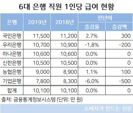 국민은행의 경우 1인당 평균 급여액이 1억1500만 원으로 가장 많았지만 가장 적은 복리후생비를 기록했던 우리은행이 1억700만 원으로 두 번째로 높은 1인당 급여액을 기록했다.