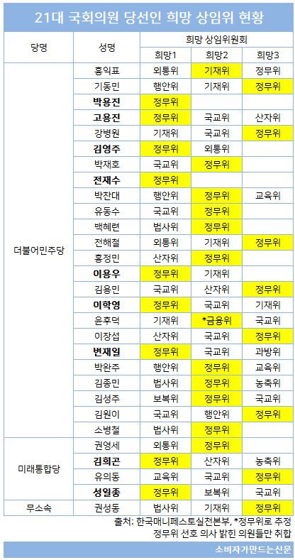 20대 국회에서도 정무위 소속이었던 이학영 의원과 고용진 의원도 나란히 정무위를 희망 상임위원회 1순위로 꼽았고 변재일 의원도 정무위를 희망 상임위로 적어냈다.