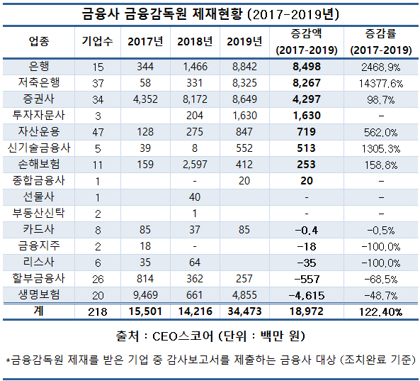 22일 기업평가사이트 CEO스코어(대표 박주근)가 금감원의 제재 조치가 완료된 금융사 중 감사보고서를 제출하는 218개 기업을 대상으로 2017년부터 2019년까지 현황을 분석한 결과, 금감원이 금융사에 내린 과징금 및 과태료는 344억7300만 원으로 2년 전보다 122.4%(189억7200만 원) 증가했다.