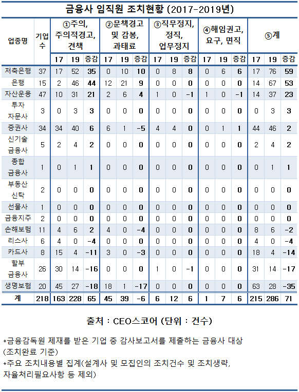 제재 건수 역시 지난해 총 310건으로 2017년(259건) 대비 19.7%(51건) 늘었고, 임직원의 견책‧정직‧해임권고 등 신분상 주요 제재 조치 건수(286건)도 같은 기간(215건) 대비 33.0%(71건) 증가했다.