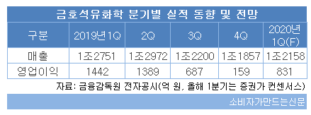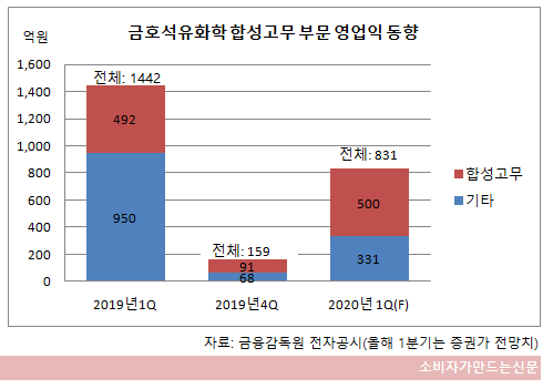 금호석유화학의 올해 1분기 전체 영업이익 전망치는 지난해 같은 기간보다 44% 감소한 831억 원이 예상된다. 전체 매출 중 합성고무 사업이 60%를 차지하며 실적을 견인하는 셈이다. 금호석유화학은 합성고무, 합성수지, 정밀화학, 건자재, 에너지 등의 사업군을 영위하고 있다.
