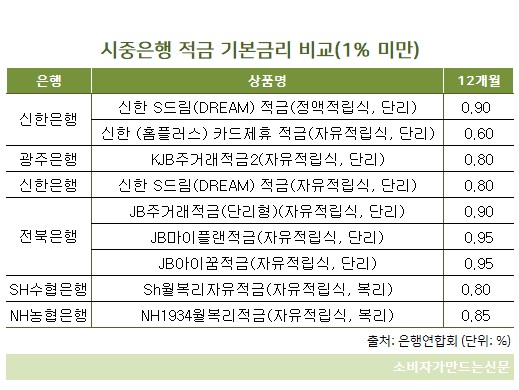 정액적립식의 경우 신한은행의 신한 S드림(DREAM) 적금의 12개월 기본금리가 0.90%(단리)로 확인됐다. 자유적립식 적금은 신한은행 신한(홈플러스) 카드제휴 적금을 비롯한 8개의 상품이 1% 미만의 금리를 기록했다.
