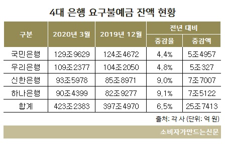 실제로 지난 3월 기준 4대 은행의 요구불예금은 석 달 새 26조원 가까이 증가한 것으로 나타났다.