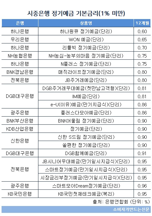 이밖에 △우리은행 WON 예금(0.65%) △하나은행 리틀빅 정기예금(0.70%) △NH농협은행 NH농심-농부의마음 정기예금(0.75%) △하나은행 N플러스 정기예금(0.75%) 등의 기본금리가 한은 기준금리보다 낮거나 같았다.
