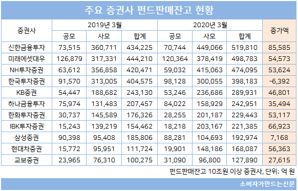 줄곧 판매잔고 1위를 유지했던 미래에셋대우는 전년 대비 5조4573억 원 증가했지만 신한금융투자에 밀려 2위로 한 단계 내려왔다. 특히 공모펀드 판매잔고가 6000억 원 이상 줄었지만 3월 말 기준 12조364억 원으로 가장 많았다.