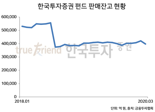 한편 한국투자증권(대표 정일문)은 판매잔고 10조 원 이상 증권사 중에서 유일하게 역성장했다. 올해 3월 말 기준 한국투자증권의 펀드 판매잔고는 전년 대비 6392억 원 감소한 39조8183억 원으로 4위에 머물렀다. 공모펀드는 6558억 원 증가했지만 사모펀드 판매잔고가 1조2950억 원 감소하면서 전체 판매잔고도 순감했다.