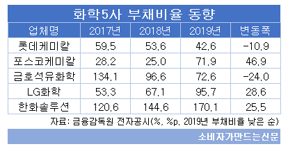 화학5사 중 가장 부채비율이 낮았던 곳은 롯데케미칼(대표 김교현)로 전년보다 10.9%포인트 하락한 42.6%를 기록했다. 롯데케미칼의 부채비율은 2017년 59.5%에서 지속 하락세를 보이고 있다. 롯데케미칼은 우량한 재무구조 속에서도 더욱 보수적으로 자금을 운용해 부채비율을 추가적으로 낮춰오고 있다.