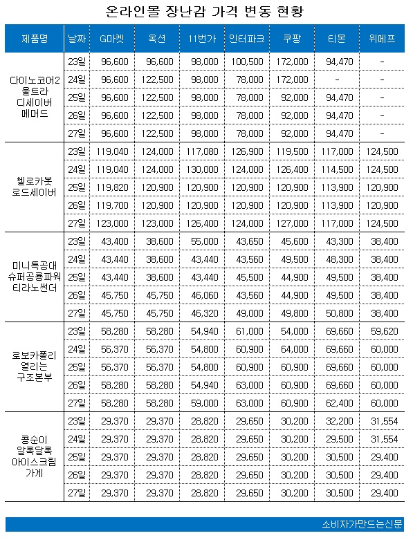 소비자가만드는신문이 지난 23일부터 5일간 G마켓, 옥션, 11번가, 인터파크, 쿠팡, 티몬, 위메프 등 7개 오픈마켓에서 판매하는 장난감 5종의 최저가를 조사한 결과 가격 변동이 크지 않은 것으로 나타났다.