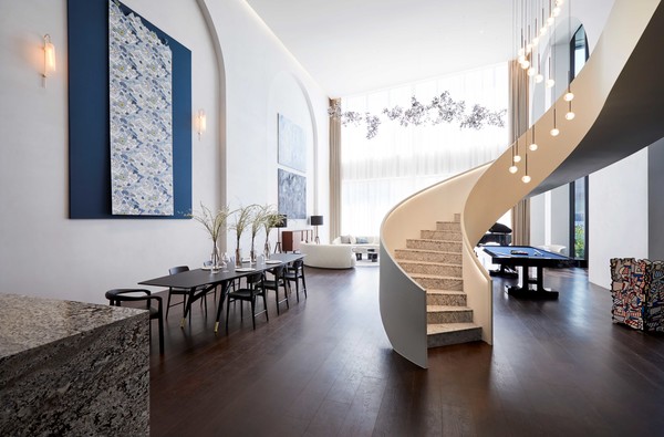 두번째 집은 다양한 취미를 지닌 가족의 일상을 반영했다. 높은 층고(8.1m)가 특징인 515㎡ 규모의 복층형 펜트하우스로 꾸며졌다. 가족 공용공간인 1층과 침실을 중심으로 개인적인 공간으로 구성된 2층으로 나누어 동선을 분리했다. 대형 드레스룸과 분리형 욕실, 전용 풀을 갖추어 고급 리조트같이 연출됐다. 와인 셀러와 무비스튜디오, 티룸 등 개성이 뚜렷한 최상위층의 주거 공간을 경험할 수 있다.