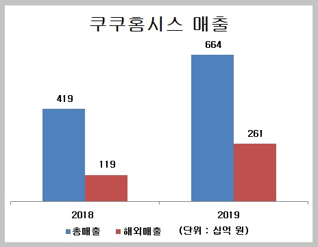 쿠쿠홈시스는 2017년 기업분할 후 집계 가능한 해외 매출이 2018년 1191억 원에서 지난해 2606억 원으로 118.9% 증가했다. 해외비중은 28.4%에서 39.3%로 10%포인트 이상 상승했다. 전체 매출은 58.5% 늘었다.