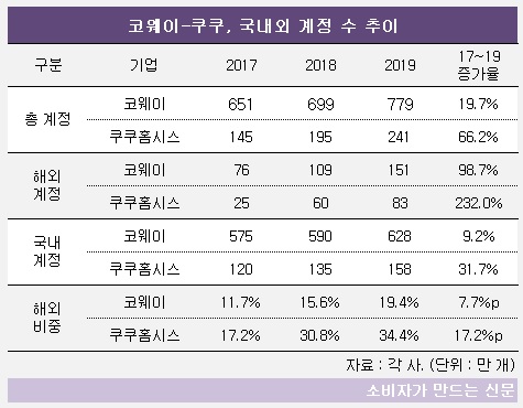 코웨이와 쿠쿠홈시스의 해외 계정 수는 매년 눈에 띄게 증가하고 있다.