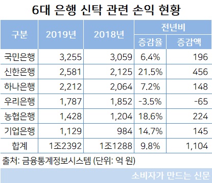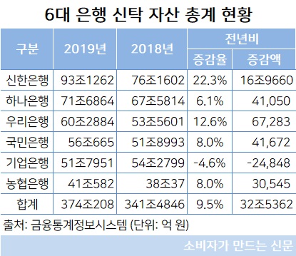 금융감독원 금융통계정보시스템에 따르면 작년 말 6대 은행의 신탁자산 총액은 374조208억 원으로 1년 만에 32조5362억 원 증가했다. 신한은행이 20%가 넘는 증가율을 기록하는 등 기업은행을 제외한 모든 은행의 신탁자산 규모가 크게 늘었다.