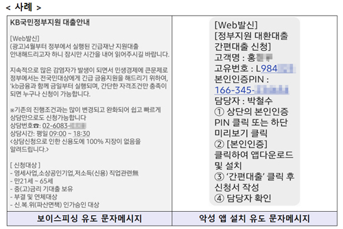 최근 신고된 보이스피싱과 스미싱 유형을 살펴보면 ‘정부긴급재난지원대출 안내’를 빙자하고 ‘KB국민지원’, ‘우리금융지원’ 등 제도권 은행의 상호나 ‘서민금융진흥원’, ‘국민행복기금’ 등 공공기관을 사칭하는 경우가 많았다.