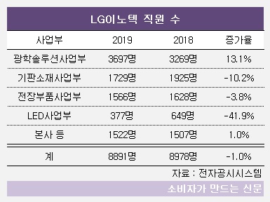 금융감독원 전자공시시스템에 따르면 LG이노텍의 지난해 말 기준 직원 수는 8891명으로 전년 8978명 대비 1% 감소했다.