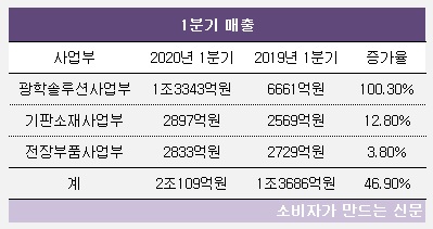 매출은 2조109억 원으로 46.9% 증가했다. 광학솔루션부문 매출이 6661억 원에서 1조3343억 원으로 두 배 이상 증가한 영향이 컸다.
