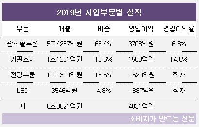 LG이노텍은 지난해 4031억 원의 영업이익을 기록했는데, 광학솔루션이 3708억 원, 기판소재가 1580억 원을 벌었다. LED와 전장부품은 각각 837억 원, 520억 원 적자를 냈다.
