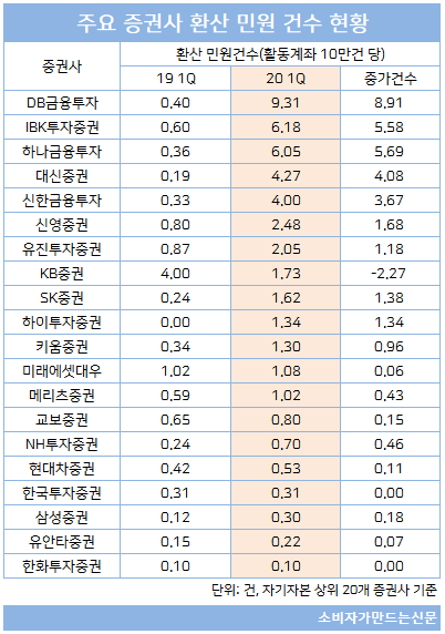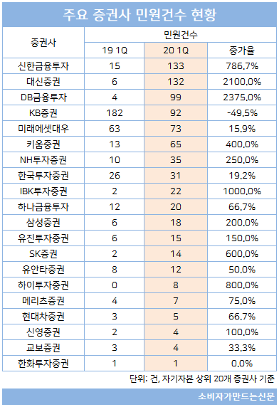 특히 라임자산운용 펀드를 비롯해 일부 금융상품에서 발생한 손실로 인해 신한금융투자와 대신증권의 민원이 급증했다. DB금융투자와 키움증권 등 일부 증권사의 경우 MTS 접속장애 관련 민원이 많았다.