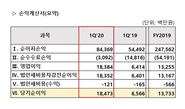 2019년 한 해 137억 원의 당기순이익을 기록하며 연도 기준 첫 흑자를 달성한 카카오뱅크는 견조한 대출자산 성장에 따른 이자수익 증가와 함께 수수료 부문의 적자폭이 개선되며 1분기 당기순이익이 전년 동기 대비 큰 폭으로 증가했다.
