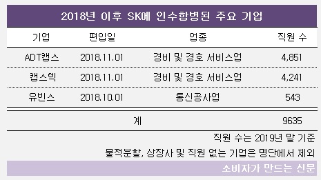 SK는 사물인터넷(IoT)을 활용한 보안사업 진출을 위해 2018년 11월 ADT캡스(대표 박진효)와 캡스텍(대표 박세영) 등을 인수했다. 2018년 인수한 유빈스홀딩스 계열사 등 직원 규모가 비교적 큰 3곳의 직원 수는 9635명에 달한다.