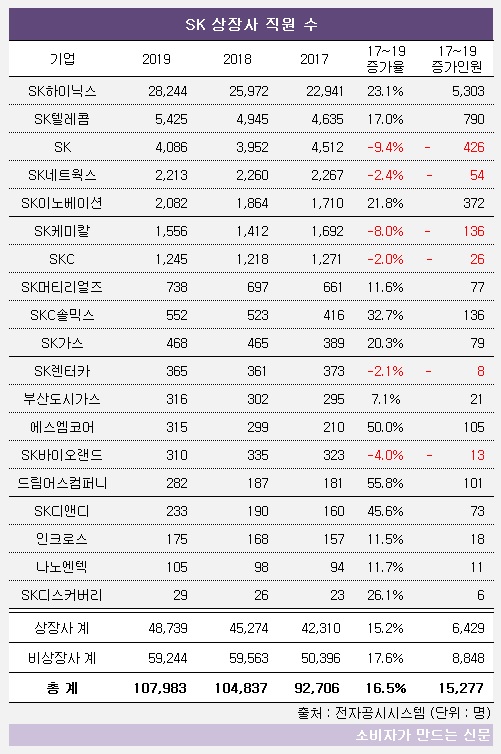 SK하이닉스를 제외하면 SK 상장사 직원 수 증가율은 5.8%로 뚝 떨어진다.
