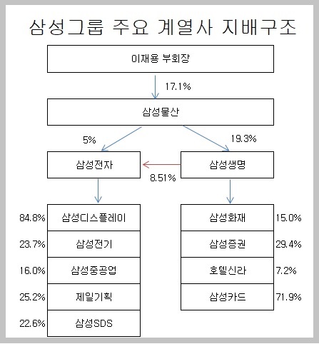 삼성은 현재 삼성물산(대표 이영호·고정석·정금용)이 지주회사 역할을 하며 삼성전자(대표 김기남·김현석·고동진), 삼성생명(대표 전영묵), 삼성SDS(대표 홍원표) 등 주요 계열사를 지배한다. 삼성전자는 이건희 회장(4.18%), 이재용 부회장(0.7%), 삼성생명(8.51%) 등이 특수관계자를 형성하고 21.21% 지분을 보유하고 있다.