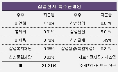 이런 상황에서 지주사 구축의 핵심인 삼성전자 인적분할은 특별결의사항으로 주주의결권의 2/3 이상의 찬성이 필요한데, 특수관계인 지분율은 20%를 갓 넘는 수준에 그친다. ‘삼성생명→삼성전자’의 고리를 끊는 것도 20조 원 이상의 천문학적인 비용이 필요하다. 삼성의 지주사 전환 검토는 이미 2017년 중단됐다.