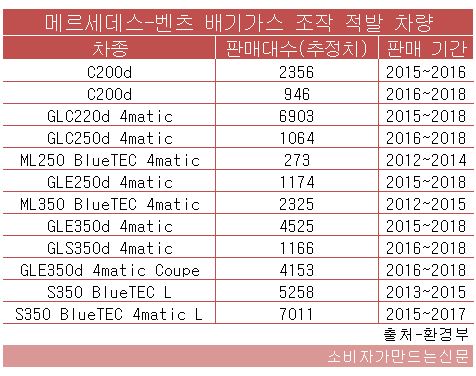 실제 환경부가 이번에 발표한 메르세데스-벤츠코리아의 C200d(연도 다른 2종), GLC220d 4Matic, GLC250d 4Matic, ML250 BlueTEC 4Matic, GLE250d 4Matic, ML350 BlueTEC 4Matic, GLE350d 4Matic, GLS350d 4Matic, GLE350d 4Matic Coupe, S350 BlueTEC L, S350 BlueTEC 4Matic L 12종은 현재 판매되는 모델은 아니다.