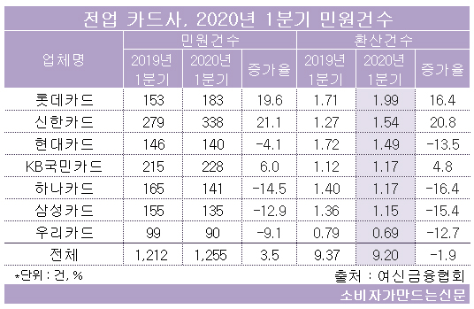 11일 여신금융협회에 따르면 올해 1분기 전업 카드사 7곳의 민원건수는 1255건으로 전년 동기 1212건 대비 3.5% 증가했다. 카드발급 10만 건 당 민원건수를 의미하는 환산건수는 9.2건으로 전년 동기 9.4건 대비 1.9% 감소했다.