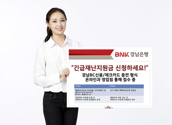 경남은행 카드사업부 송영훈 부장은 “국민생활 안정과 경제 회복을 위한 긴급재난지원금이 국민들에게 신속하게 지급될 수 있도록 전산시스템과 직원교육을 이미 마쳤다”며 “BNK경남은행과 경남BC신용/체크카드를통해 긴급재난지원금 신청하면 원활하게 지급받을 수 있을 것”이라고 말했다.