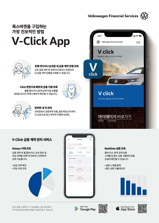 지난 2018년 11월 런칭한 브이클릭은 견적 확인에서부터 구매 계약은 물론 사후관리까지 앱상에서 원스톱으로 처리할 수 있는 수입차 최초의 비대면 자동차 금융 계약 플랫폼이다. 특히 납입료 조회 등 구매 후 차량 관리 등을 편리하게 할 수 있어 폭스바겐, 아우디 및 두카티 구매고객들의 필수 앱으로 자리 잡고 있다.