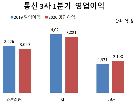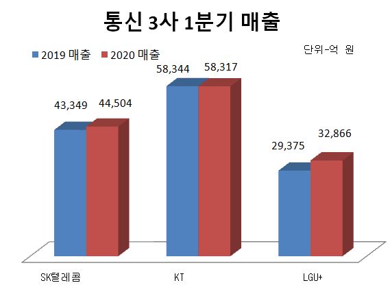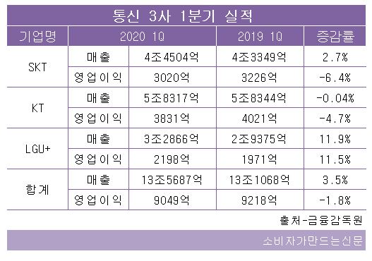 금융감독원 전자공시시스템에 따르면 통신 3사의 1분기 매출은 총 13조5687억 원으로 전년 동기보다 3.5% 증가했고 영업이익은 9049억 원으로 1.8% 감소했다.