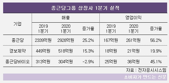 금융감독원 전자공시시스템에 따르면 종근당은 1분기 매출 2928억 원, 영업이익 261억 원의 실적을 기록했다. 전년에 비해 매출은 25.2%, 영업이익은 56.2%나 증가했다.