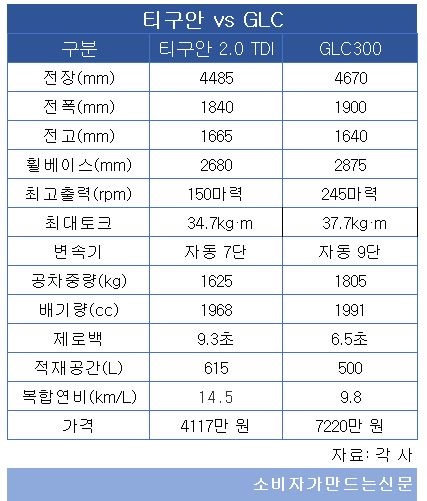 라이벌 두 모델의 중심 차량인 티구안 ‘2.0 TDI' 단일 트림과 ‘GLC350' 트림을 비교한 결과 각각의 독특한 경쟁력을 갖추어 엎치락 뒤치락 선두다툼이 가능한 것으로 나타났다.