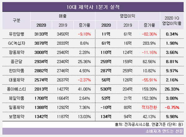 10대 제약사 가운데 유한양행과 대웅제약을 제외한 8곳은 1분기 매출이 전년 동기에 비해 늘었고, 영업이익은 GC녹십자와 종근당 등 6곳이 증가세를 보였다.