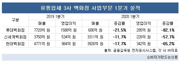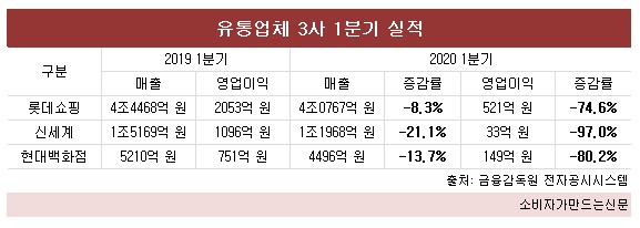 '유통 빅3' 롯데‧신세계‧현대百, 코로나19쇼크로 영업익 급감...적자 전환 우려