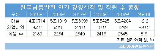 한국남동발전의 최근 실적은 지속 하향곡선을 그리고 있다. 지난 2015년 9332억 원에 달했던 영업이익은 지난해 1249억 원까지 급락했다.