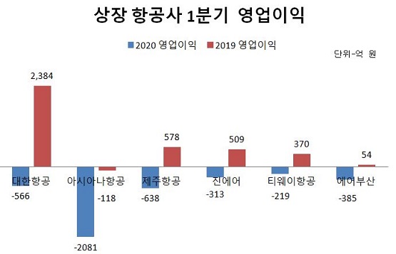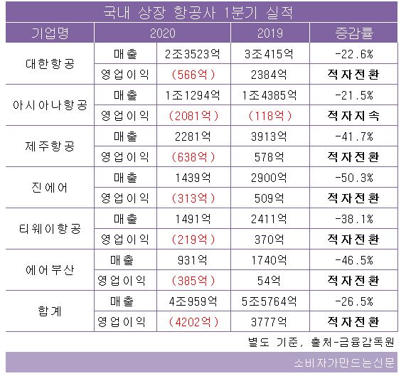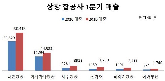 18일 금융감독원 공시에 따르면 국내 상장 항공사 6곳의 총 매출은 4조959억 원으로 전년 동기(5조5764억 원) 대비 26.5% 감소했다. 영업이익은 적자로 전환했다.
