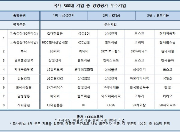 고속성장 부문은 매출 10조 원을 기준으로 나눠 평가했다. 10조 원 이상에서는 삼성전자와 삼성SDI, CJ대한통운, 포스코, 현대자동차가, 10조 원 미만은 셀트리온과 HDC현대산업개발, KCC건설, 코웨이, 현대홈쇼핑이 우수한 평가를 받았다. 고속성장의 경우 매출액 증가율과 자기자본이익률(ROE)을 평가의 근거로 삼았다는 게 CEO스코어의 설명이다.