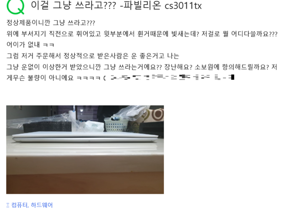 이 씨는 “새 제품을 구매한 소비자가 손으로 휘어진 부분을 펴가면서 쓰라는 말인지...불량이 명확한 제품을 판매하고 무조건 불량이 아니라고 우기는 꼴”이라며 "기업과 소비자 간의 신뢰를 무너뜨리며 공정한 거래 행위를 제한하는 악질적인 횡포”라며 분개 했다.