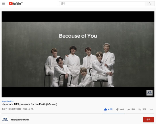 영상을 본 한 시청자는 “영상과 메시지가 잘 어우러지고 사회적 책임에 대해 고민하는 현대차에 더 관심을 갖게 된다”는 댓글을 남겼다고 현대차는 전했다. 현대차 관계자는 “앞으로도 방탄소년단과 함께 진정성을 담아 친환경과 지속가능성에 대해 알릴 수 있는 다양한 활동을 선보일 것”이라고 밝혔다.