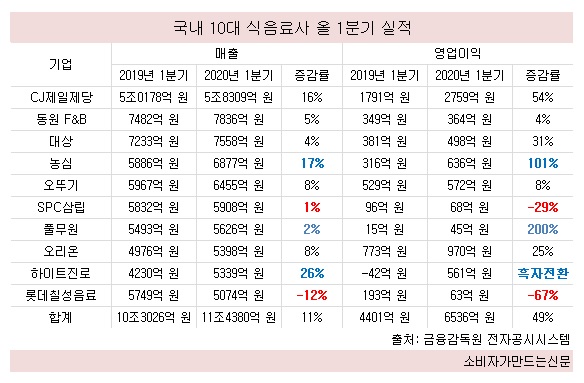 금융감독원 전자공시시스템에 따르면 올 1분기 매출 기준 상위 10개사의 총 매출은 11조4380억 원으로 전년 대비 11% 증가했다. 같은 기간 영업이익은 6536억 원으로 전년 대비 49%나 늘었다.