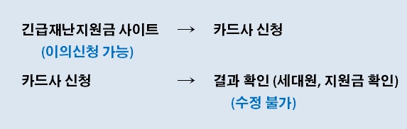 현재 신한카드, KB국민카드, NH농협카드, 삼성카드, 우리카드, 현대카드, 하나카드, 롯데카드, BC카드 등 긴급재난지원금 연계가 가능한 카드사들은 동일한 접수 시스템을 구축하고 있다.